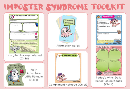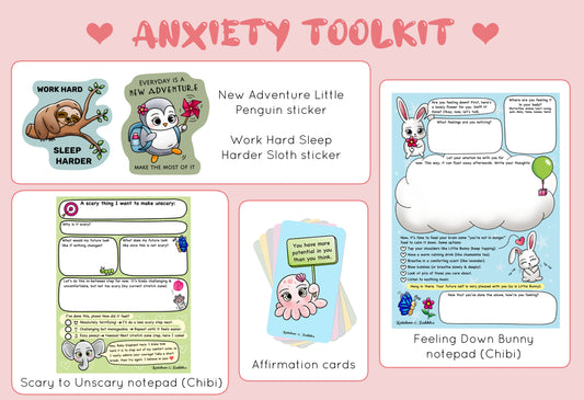 Each toolkit is carefully curated to help you overcome specific hurdles, like anxiety or feeling overwhelmed. All of them come with adorable kawaii companions who'll douse you with happy hormones. With regular use, it'll help you feel more positive, calmer, and more prepared to get out of your comfort zone. Our cute besties don't judge and are eager to cheer you on!